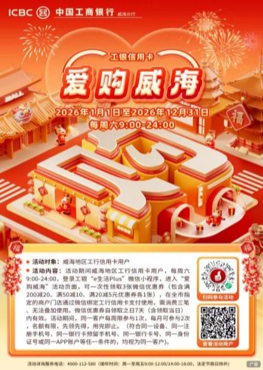 商超采購(gòu)、酒店住宿、餐飲消費(fèi),是城市煙火氣的直接體現(xiàn),也是激發(fā)消費(fèi)潛力的關(guān)鍵場(chǎng)景。工行威海分行聚焦威海本地消費(fèi)市場(chǎng),重磅推出“愛購(gòu)?fù)!毙庞每▋?yōu)惠活動(dòng),以全年常態(tài)化優(yōu)惠,激活商超酒店餐飲等場(chǎng)景消費(fèi)活力。