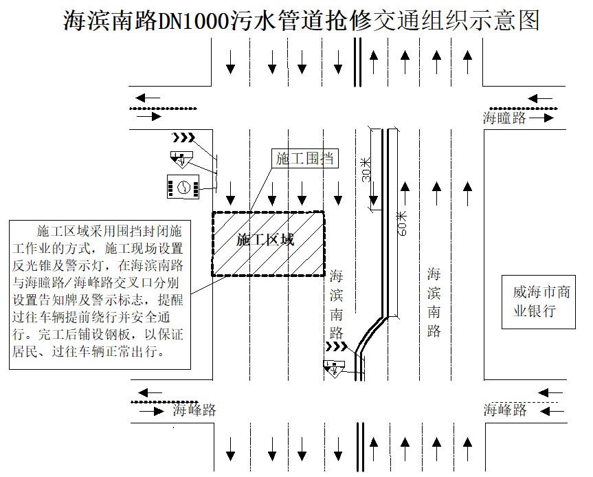 因海濱南路(海瞳路口向南40米)污水管道故障,經(jīng)相關部門批準,水務集團于10月29日開始對該處管道進行維修,為確保工程順利實施及施工期間的交通安全,現(xiàn)公告如下: