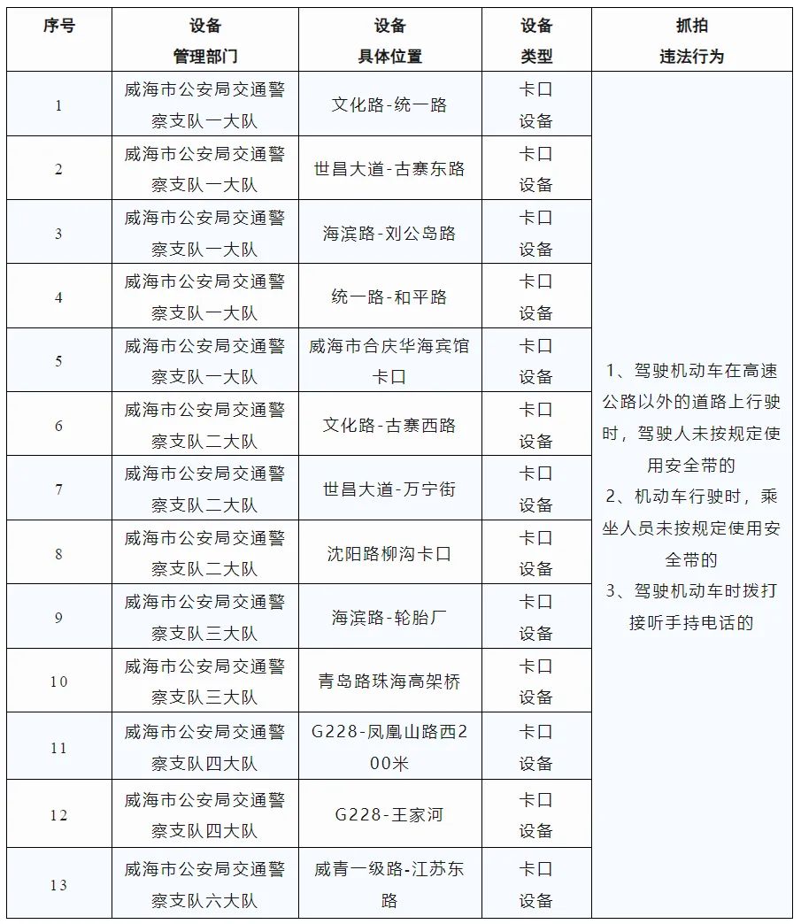 為保障道路交通安全,預(yù)防和減少交通事故的發(fā)生,根據(jù)《中華人民共和國道路交通安全法》及其實(shí)施條例等法律法規(guī)和相關(guān)技術(shù)規(guī)范的規(guī)定,依據(jù)《公安機(jī)關(guān)執(zhí)法公開規(guī)定》,現(xiàn)將新增的13處交通技術(shù)監(jiān)控設(shè)備予以公示,自2024年9月1日起,將對有關(guān)交通違法行為進(jìn)行依法管理,請廣大道路交通參與者自覺遵守相關(guān)法律法規(guī),共同維護(hù)良好的道路交通秩序。