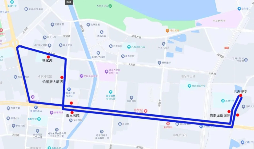 站點(diǎn)設(shè)置:楊家灘、鉑麗斯大酒店、市立三院、信泰龍瑞國(guó)際、五洲中學(xué)、信泰龍瑞國(guó)際、市立三院、楊家灘。