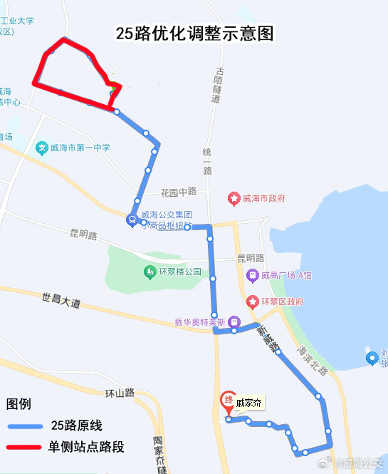 威高花園樞紐站改為途經站,調整后,25路改為戚家夼環(huán)行運行,由戚家夼發(fā)車,按原線運行至威高時光城站點后,改行宮松嶺路、遠遙墩路、臥龍山路、宮松嶺路按原線路返回戚家夼站點。威高花園區(qū)域站點調整為單側???。