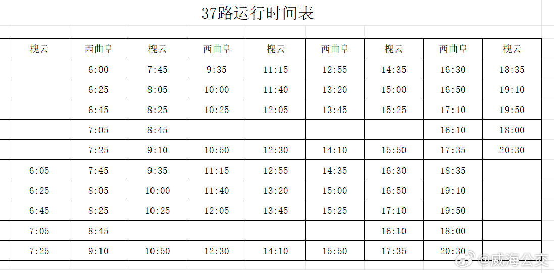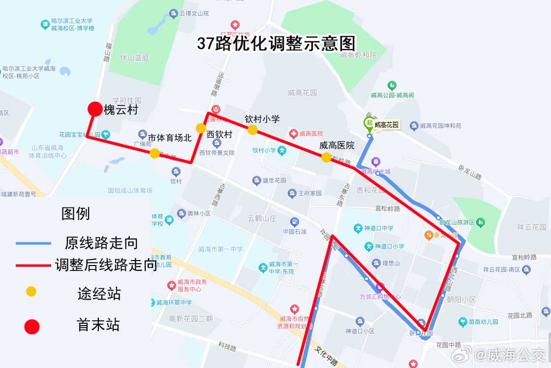 調整后,37路由西曲阜發(fā)車,按原線路運行至威高時光城站點,改行宮松嶺路、遠遙墩路、花園中路、福山路至槐云村站點,取消威高花園1個站點,增設威高醫(yī)院、欽村小學、西欽村、體育場北、槐云村5個站點。