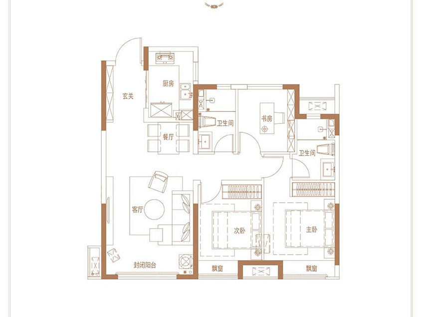 三面通透,超長瞰景陽臺,主臥帶270度觀景飄窗,廚房采用U型布局。