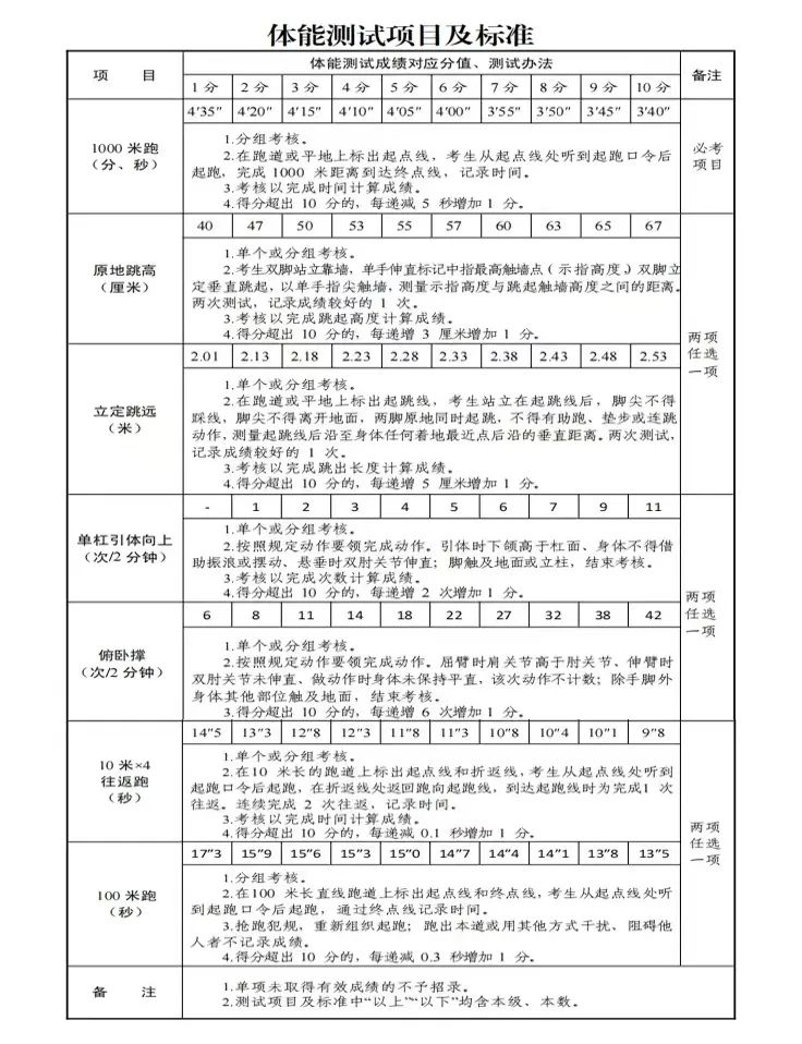 03體能、體型測試:標(biāo)準(zhǔn)參照《國家綜合性消防救援隊(duì)伍消防員招錄體能測試、崗位適應(yīng)性測試項(xiàng)目及標(biāo)準(zhǔn)》執(zhí)行。考核項(xiàng)目為:1000米跑必考項(xiàng);原地跳高、立定跳遠(yuǎn),兩項(xiàng)選一項(xiàng);單杠引體向上、俯臥撐,兩項(xiàng)選一項(xiàng);10米×4往返跑、100米跑兩項(xiàng)選一項(xiàng)。主要考察招收對象肌肉力量、肌肉耐力和爆發(fā)力等。